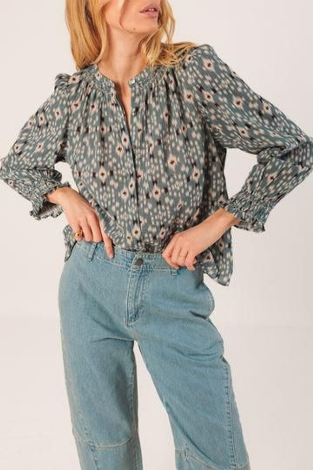 Chemise col rond avec smocks, fait à la main au niveau de l'encolure et les poignets, boutonnée devant, Coupe légèrement ample
