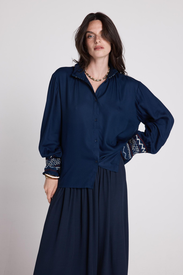 Chemise manches longues au col légèrement montant, brodée et smockée au col et aux poignets. Manches légèrement bouffantes apportent une touche féminine.