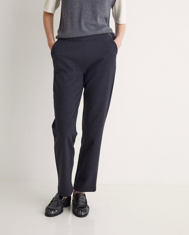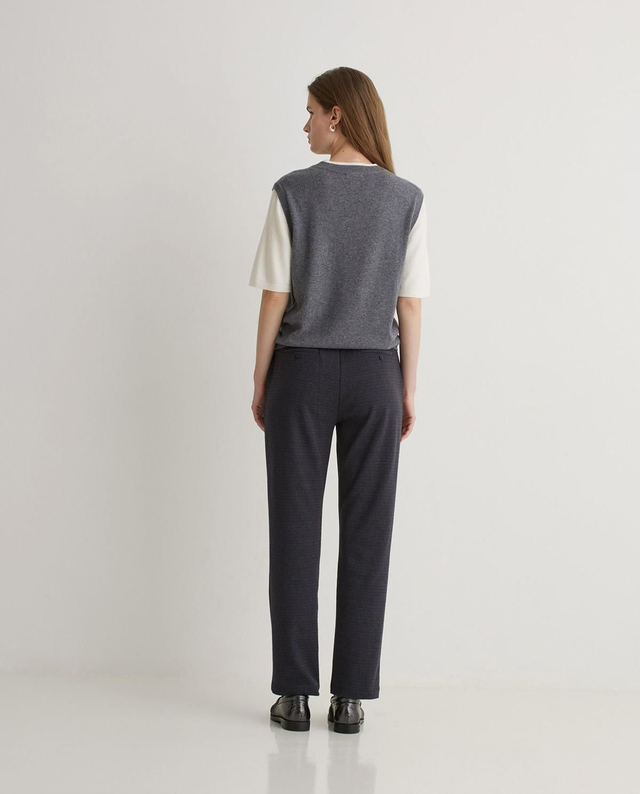 Pantalon droit jacquard. Imprimé à carreaux. Coupe droite. Sans fermeture. Ceinture élastique. Deux poches latérales et 2 poches passepoilées au dos avec bouton.