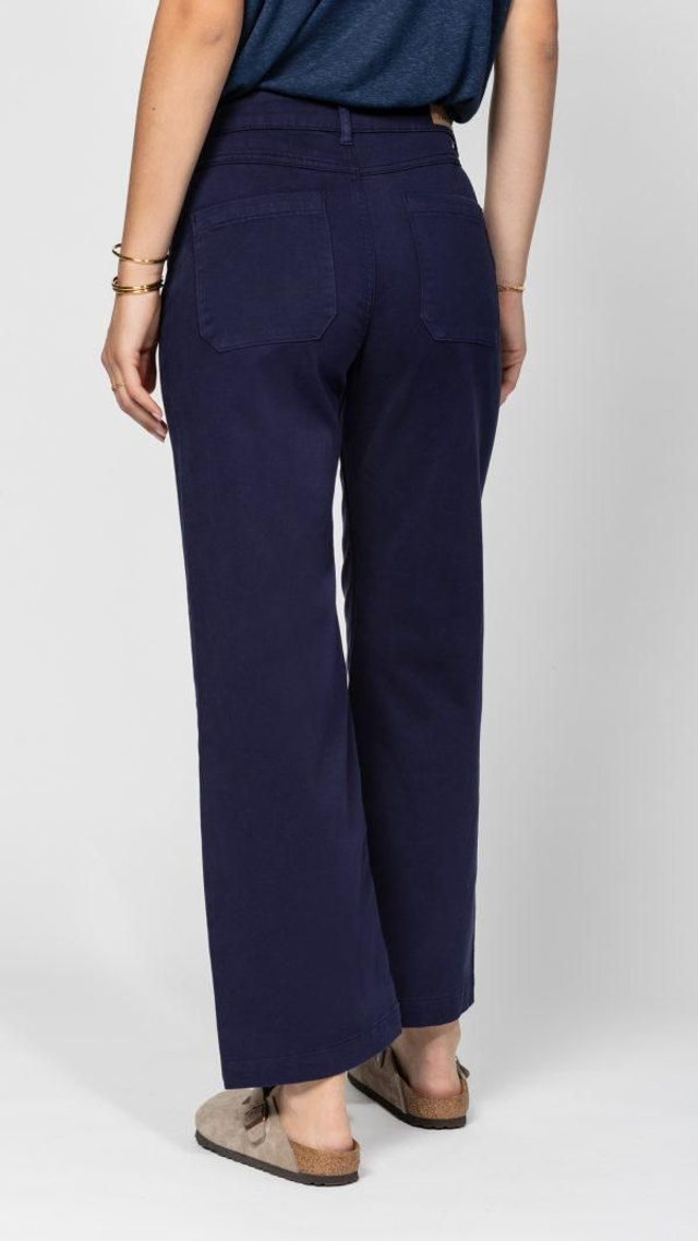 Pantalon à jambe droite et large, taille mi- haute. Existe en plusieurs couleurs